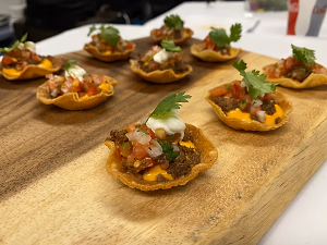 mini loaded nacho bite - beef filling with ooey gooey cheese, sour cream, and salsa