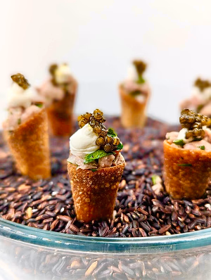 Consider our signature Beef Tartare Cones. They offer the savory depth of a steakhouse dinner but arrive with vertical elegance, allowing guests to indulge without interrupting their conversation. For texture, our Caviar Potato Chips serve as the ultimate pairing for premium sparkling wine. The crisp snap of the chip, the richness of crème fraîche, and the brine of the caviar create a perfect bite that feels both playful and undeniably luxurious.