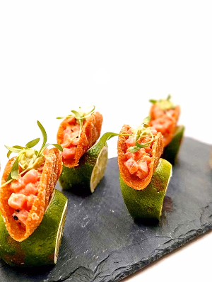ahi tuna poke taco - wonton crisp taco with mango, avocado, sesame and micro cilantro