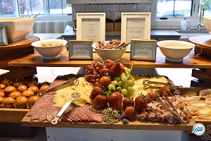 Antipasto platter on a display in the kitchen. cheeses served with cured meats, olives, pickled accompaniments. Piled with frsh fruit and next to the mini bbq chicken sliders!
