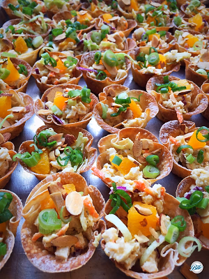 Asian Chicken Salad on Crispy Wonton Bites. Closely displayed on wooden tray.