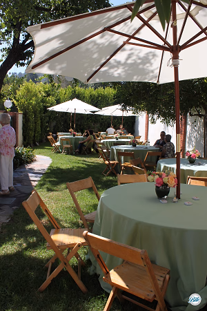 Tables with green linen and wooden chairs set up in backyard with umbrellas