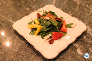 Baby spinach salad with fresh mango, strawberry, goats cheese mousse, candied pecans, frizzled shallot garnish and champagne vinaigrette