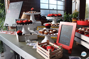 School themed dessert bar with apple for teacher cupcakes, wood crates, s'mores bites and red accents