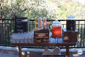 Rustic BBQ beverage station with homemade lemonade in beverage dispensers on wooden crates with chalkboard signage
