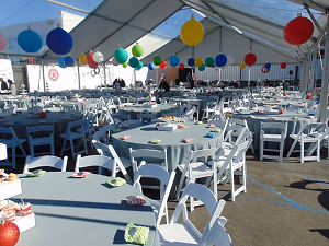 Large outdoor private event area set up with tables and balloons at the Automobile Driving Museum