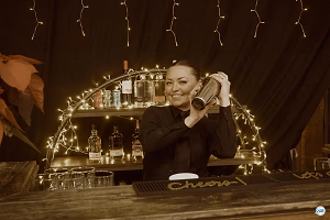 A bartender mixing a drink in a cocktail shaker with a smile.