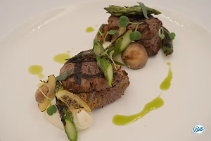 Grilled duo of beef medallions. Wet aged with mustard and tarragon, flambéed mushrooms, pickled pearl onions, chive oil, and caramelized lemon. served with celeriac puree and charred asparagus