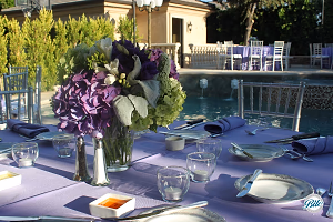 Backyard dining with lavender and green colors