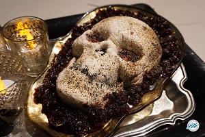 Cranberry-orange blood oozing from a goat cheese based skull.