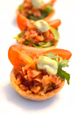 blt canapés - handmade buttered and toasted bread cups with arugula, creamy pesto aioli, crispy bacon and sweet grape tomato
