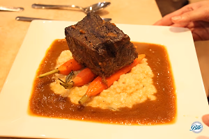 Braised Short Rib with mushroom risotto cake, honey glazed roasted carrots and red wine pan sauce