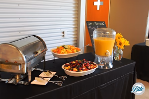 'Good morning' breakfast station with Orange Juice, Sausage, Scrambled Eggs, Berries, and Fruit