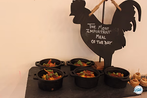 Cast Iron filled with hash browns covered with eggs, cheese, and peppers. Decor includes chicken with reminder that breakfast is the most important meal of the day