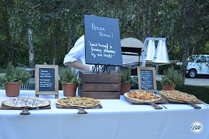 Hand tossed pizza action station with: white clam, BBQ chicken and vegetarian pizzas for guests