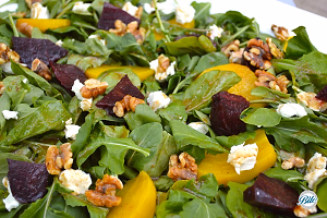 Roasted beet salad with cheese, walnuts, and honey balsamic dressing.