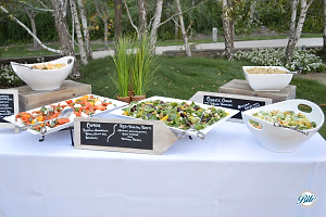 Salad display with: roasted beet, caprese, caesar, and quinoa salads on farm to table inspired stationary display.