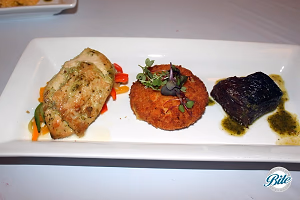 Duo Plate of Herb Chicken Breast with lemon sauce and red wine braised beef short rib