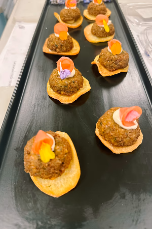 Chickpea falafel, pickled radish, cilantro sprouts. On sweet potato chip. Vegan.