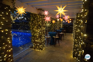 A clear tent creates a beautifully lit up covered space (with twinkling lights and stars) next to the pool on a crisp winter evening. A terrific waterfront view from the nearby hightops!