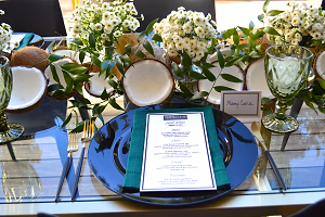 Close-up view of the beautiful table setting for TRESémme–Influencer Day, with fresh white flowers and halved coconuts placed among the floral arrangements. At the center of the setting is a black plate with a green napkin placed neatly under a printed menu, detailing the courses to be served. The name card beside the plate indicates the guest's seating assignment.