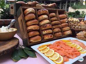 Bagels on display with smoked salmon and lemons. Flavored cream cheese and toppings on side