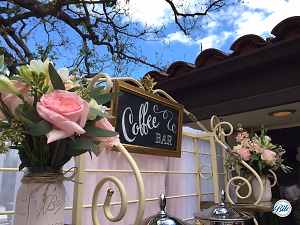 Chalkboard Coffee Bar sign surrounded by flowers in mason jars