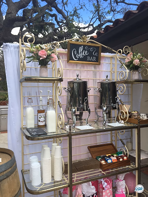 Coffee Bar display with chalkboard sign, rustic wine barrel, creamer, sugar, flavored syrups. White and pink backdrop with floral decor in mason jars