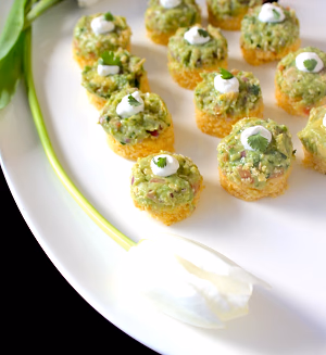 Cornbread Canape With Zesty Chicken Guacamole, Crema and Cilantro. Served on a white tray with flowers