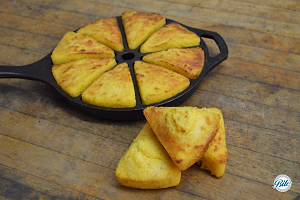Cornbread on a wooden cutting board with some in cast iron pan behind