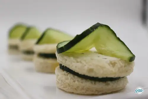 Round cucumber sandwiches with cucumber slice on top from Bite Catering's full-service high tea menu