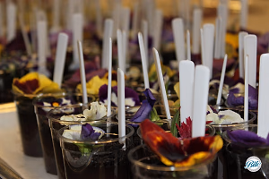 “Cup of Dirt” Chocolate Pot De Crème Dessert Shots with mini shovel spoons and edible flowers. Made for green event as part of a garden themed dessert display