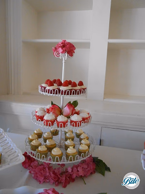 Mini cupcakes on display for wedding on shabby chic display with pink roses and hydrangeas