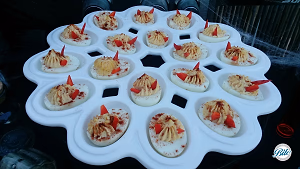 Devilled eggs with devil horns - passed appetizer for Halloween