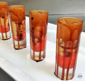 Chocolate Coated Shot Glasses with Strawberry Puree, Bailey’s Pastry Cream, Whipped Cream and Shaved Chocolate