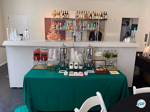Spa water, tea, coffee, ice tea on a table with liquor in the back