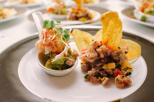 Lobster tasting spoon and island ceviche with plantain chips