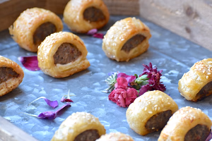 English Sausage Rolls with mustard dipping sauce passed on a wooden tray with flower garnish