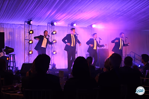 The group The Company Men sings on stage