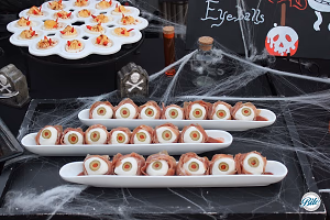 Eyeballs and Devil's Eggs on Halloween DisplayBocconcini Eyeballs with prosciutto, olive, parma ham and bloody ooze. Classic devilled egg with devil horns! On a Halloween display with assorted tombstones, vials of blood, cobwebs...and all the other ghastly details