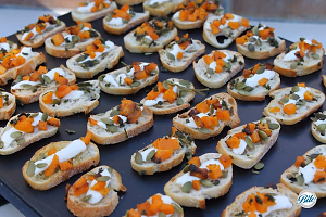 Roasted pumpkin crostini with pumpkin seeds on black tray