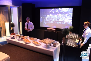 Corporate private film screening with stationary food display and bar, with Bite staff ready to greet guests