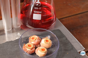 Creepy eyeball bites for Halloween next to beaker