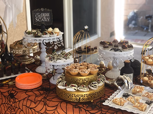A Halloween dessert bar with mini autumn pies, mummy berries, dirt cups, ghost cupcakes, and gooey butter cake bars!