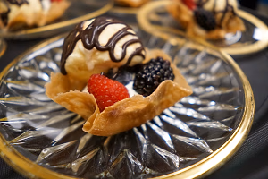Plated dessert with vanilla bean ice cream, seasonal berries, bourbon creme anglaise, chocolate sauce, chantilly cream. Served on gold-rimmed dessert plate.