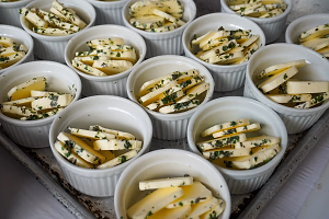 Herb infused butter sliced for bread service in rammekins