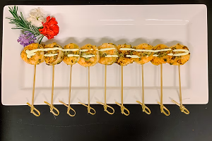Tray Passed Herb Mediterranean Shrimp on Picks. Shot from overhead on a white tray with black background.
