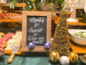 Holiday appetizer table with closeup of cheese and charcuterie assortment with fruit, grapes, nuts, and holiday decor