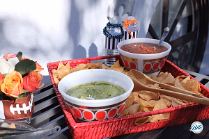 Tray containing our freshly fried chips and homemade guacamole and salsa in bowls. Football themed decor.