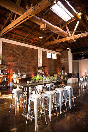 A view of the brick walls, high wooden ceilings and naturally lit space of At the P. This flexible setup was used for a networking and product launch event.